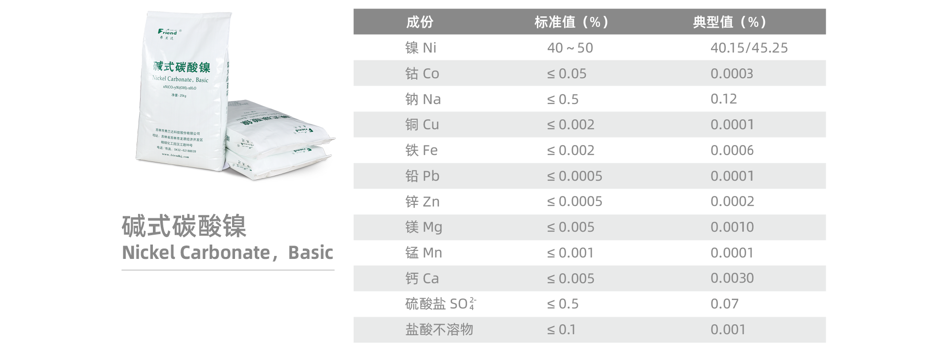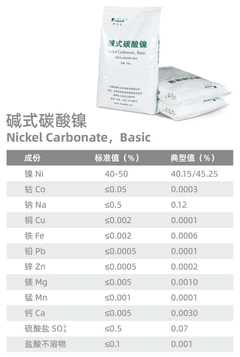 堿式碳酸鎳(Nickel Carbonate,Basic) 分子式:NiCO3 ?2Ni(OH)2 ?4H2O 分子量:376.63 性 狀:淡綠色粉末。 用 途:用于電鍍及制其他鎳鹽的原料。 包 裝:編織袋裝,每袋25公斤。 儲 運:運輸過程中,防止雨淋,受熱,受潮。嚴(yán)禁與酸類物品混運。貯存在通風(fēng)、陰涼、干燥的庫房內(nèi),防止雨淋、受潮。嚴(yán)禁與酸類物品混貯。